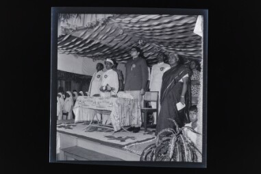Indoor portrait. Three fourth shot. Event. 6 men are standing and 2 women are standing on the stage. On the right side nuns are standing in a group…