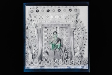 Outdoor solo portrait, full-length shot, pink washed image of a woman wearing saree and adorned with jewels, sitting on a decorated stage, facing…