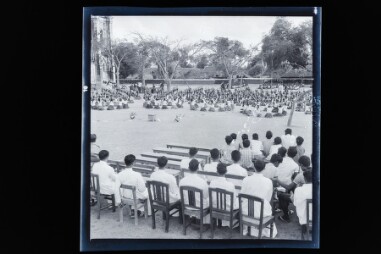 Deteriorated. Outdoor portrait. Wide shot. School students are performing a dance wearing school uniform on the ground. Teachers are sitting on the…