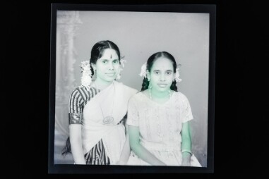 Slightly deteriorated on the left side. Studio portrait. Pink wash. Full length shot. A girl is standing wearing skirt and blouse(pavada sattai),…
