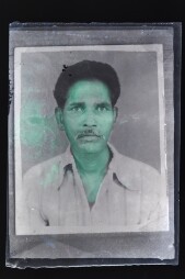 Studio portrait. Pink washed face and neck. Passport sized image of a man wearing a shirt. He has a moustache. The background is plain.Extent and…
