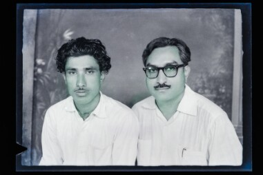 Studio portrait. Pink washed faces. Half length shot. Two men are sitting wearing shirt and spectacles. Both of them has moustache. Background has…