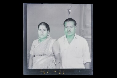 Studio portrait. Slightly deteriorated on the top. Pink washed faces. Couple portrait. Half length shot. Husband and wife are sitting wearing saree…