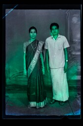 Studio portrait. Pink washed image. Husband and wife are standing wearing saree,chain,bangles(valayal),ear studd(thodu),nose studd(mukuthi),shirt,…