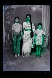 Studio portrait, full-length shot, pink washed, manipulated negative of a woman wearing a saree, sitting on a chair with hands on her thighs.…