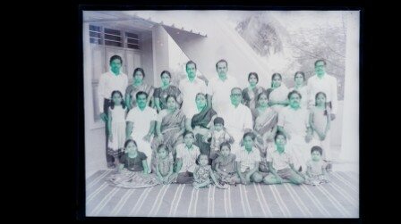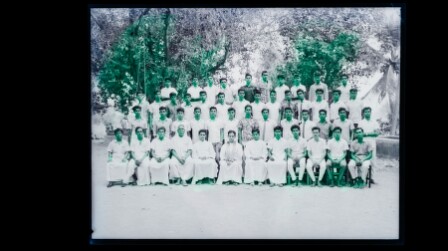 Outdoor portrait. Pink wash. Group portrait. 11 children, 7 men and 8 women are in the photograph. Children are wearing shrt and blouse(…