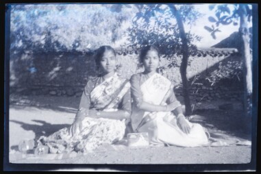 Outdoor portrait. Slightly deteriorated. Full length shot. A lady is lying down on a chair wearing saree,flower garland(poomalai),bangles(valayal),…