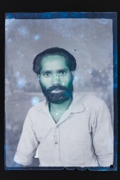 Biologically damaged negative. Studio portrait, bust shot, pink washed image of a man with beard and moustache wearing a shirt, sitting facing a…