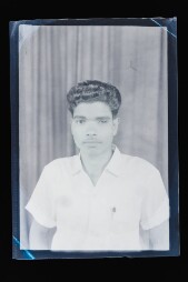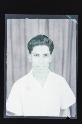 Studio portrait. Half length shot. Solo portrait of a boy wearing shirt and facing to the camera.Extent and format of original material: Film black…