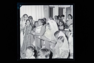 Indoor portrait. Mostly deteriorated on the left top corner and below the negative. Pink washed image. Bride and groom are sitting in the centre.…