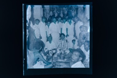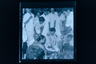 Indoor portrait. Silver deterioration. Wedding shot. The groom is sitting in the middle wearing shirt,veshti and flower garland(poomalai). An old…