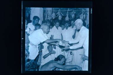 Indoor portrait. Wedding ceremony. Newly wedded couple are standing on the left side receiving coconuts,jasmine flowers(malikapoo) and bananas from…