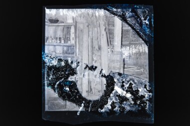 Indoor portrait. Mostly deteriorated image. View of a thatched interior having wooden shelves. There are wooden logs kept in the middle.…