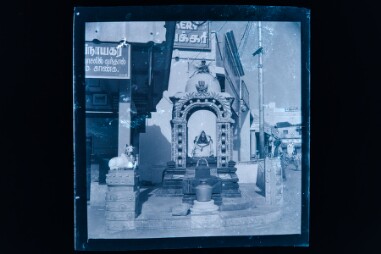 Outdoor portrait. View of a small ganesh god temple in the corner of a street. Ganesh's statue is present in the centre inside a designed arch…