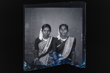 Studio portrait. Silver deterioration from the bottom. There are two ladies sitting in the middle wearing saree,necklace,long chain with big…