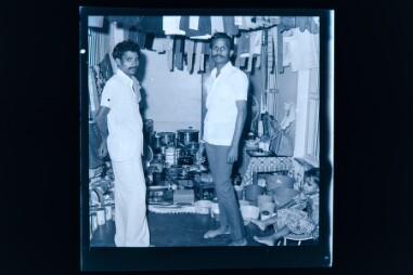 Indoor portrait. A man is standing sideways on the right side wearing a shirt and veshti. Another man is standing on the left side wearing a shirt…