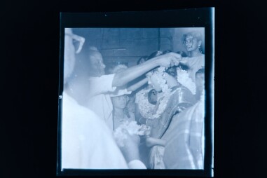 Indoor portrait. Overexposed image. An old man is putting the flower garland in bride's neck.people are standing around watching the ceremony…