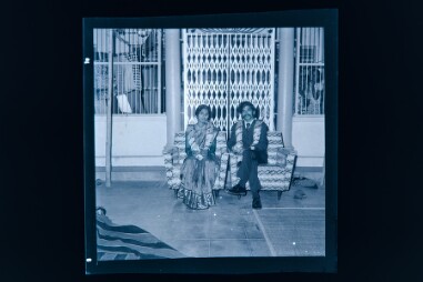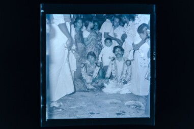 Indoor portrait. Silver deterioration. Full length shot. Wedding shot. The wedding couple are sitting wearing saree,jewells,shirt,veshti,flower…