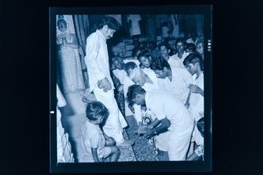 Indoor portrait. Deteriorated on the left side top of the negative. Many men are sitting on the carpet wearing shirt and veshti. Man sitting on the…