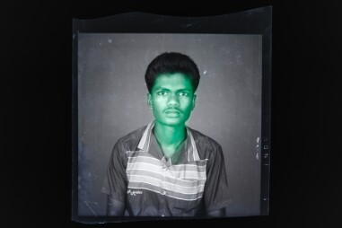 Studio portrait. Pink washed image. Half length shot. Solo portrait. A man is itting wearing a shirt and facing straight to the camera. He is…