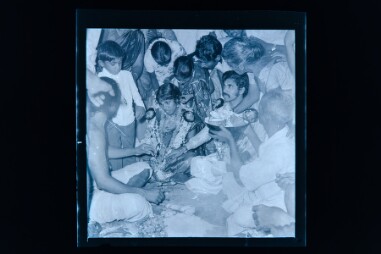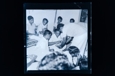 Indoor portrait. Wedding event. Many men are sitting inside a room. A man in the centre is giving sandalwood(chandanam) to a man sitting on the…