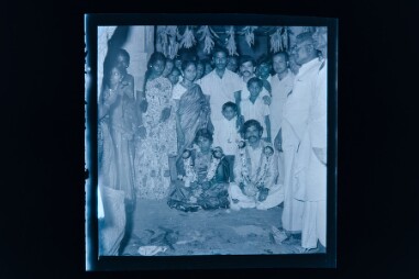 Indoor portrait. Pink washed image. Group portrait. The newly wedded couple are standing with their family members inside a temple.…