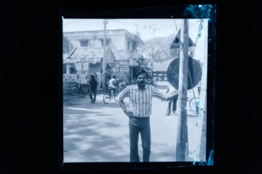 Studio portrait. Pink washed face and neck. Half length shot. A boy is wearing a shirt and having slight moustache and sacred ash(thirunoor) on the…