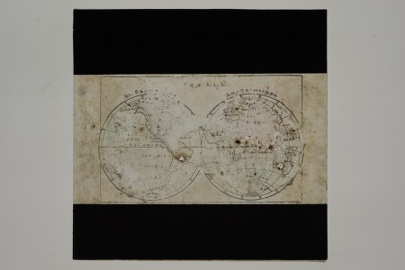 Deteriorated glass slide showing pictoral representation of world globe and the places are named in tamil.