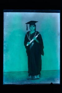 Studio portrait. Pink washed image. Full length shot. Solo portrait of a lady standing weraing saree,graduation robe and hat,chain,necklace,earring,bangles(valayal),watch,finger ring(modhiram) and customary symbol on the foreheda(pottu). She is holding the graduation certificate in her hands. The background is plain.