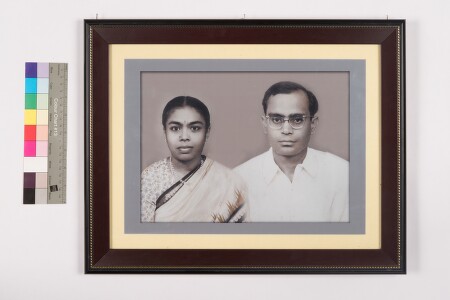 Studio portrait. Half length shot. Husband and wife are present in the image wearing saree,necklace,chain,ear studd(thodu),shirt,spectacles and customary symbol on the forehead(pottu). The background is plain.
