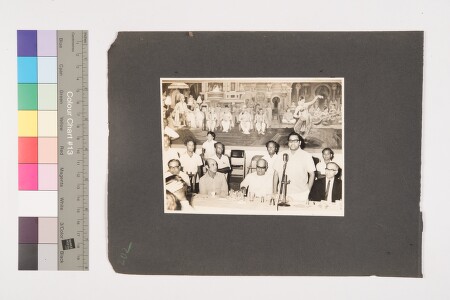 Indoor portrait. Event shot. 4 men are sitting behind the dining table. A man is standing behind the table and speaking on the mike. 7 men are stanidng behind and watching the event. There is a painting hanging on the wall at the background.