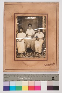 Studio portrait. Full length shot. There are three men present in the image. Two men are sitting on the chair at either side of the table present in the middle, They are wearing shirt and veshti. A man is sitting behind the table on the chair towards the right side, facing the camera wearing shirt,watch and veshti. There is a carpet lying down on the floor. The background has a studio backdrop and pillars at the sides. The name of the studio is printed at the left side of the mount as "Rathna Studio,Srivilliputtur".
