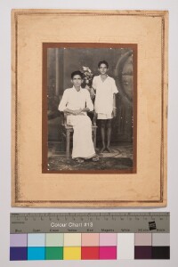 Studio portrait. Slight deterioration. Full length shot. A man is sitting on the chair with crossed legs at the right side of the image wearing jippa,finger ring(modhiram),watch and veshti. A boy is standing at the left side of the image wearing shirt,trouser and watch. He is keeping his right hand over the stool present at the back side with a flower vase over it. There is a carpet below on the floor. The background has a studio backdrop having paintings of pillars,windows,pillars and plants with flowers.