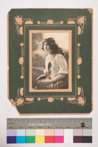 Green designed mount. Mount torn on the real right bottom corner. Hand coloured, studio solo portrait, three forth length image of a foreigner lady, wearing a frock, holding a musical instrument in hand, facong the camera. Vague background.