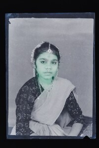 Studio solo portrait, bust shot, pink washed image of a girl wearing half saree, jewels, flowers, with a customary symbol on the forehead (potu) and facing the camera . Backdrop is plain.