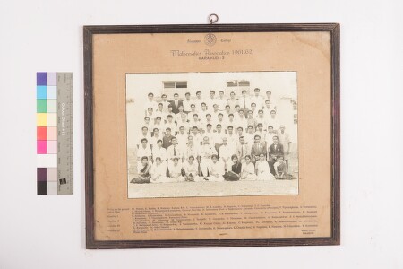 Stained mount. Outdoor group portrait, full-length shot image of more than 50 men sitting and standing in 5 rows, 6 women sitting on the floor, outside a building, facing the camera. They are the students and faculty members of Mathematics association, Algappa college, Karaikudi, batch 1961-62. their names are written on the mount. Kembu studio, Karaikudi is printed on the mount.