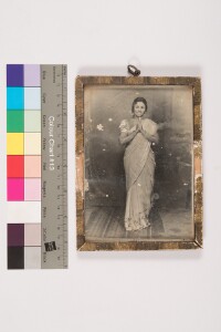 Deteriorated print. Studio solo portrait, full-length shot image of a woman wearing saree, adorned with jewels, hands in welcoming position, standing and facing the camera. Vague background. Floor is carpeted.