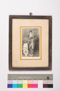 Studio solo portrait, full-length shot image of a woman wearing saree, adorned with jewels and flowers, with a customary symbol (potu) o the forehead, standing, placing her hand on a side stand with a flower vase on it, facing the camera. Backdrop is painted with images of pillar and flowers. Floor is carpeted.