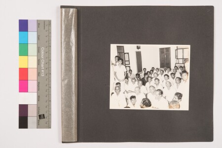 Album sheet. Indoor group portrait, full-length shot image of more than 10 men standing and stitting on the carpeted floor in a hall. Some facing the camera.