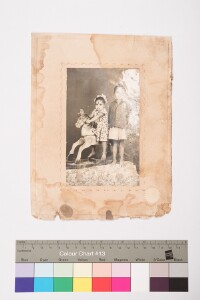 Deteriorated print. Studio portrait, full-lengh shot image of a girl wearing skirt and blouse, sitting on a wooden rocking horse, and a boy wearing shirt and trousers is standing beside her on the real left side, Plain background.