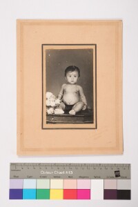 Studio solo portrait, full-length shot image of a baby wearing only vest, long chain, bangles, with a customary symbol on the forehead, sitting on a wooden table, with flowers on the real right side, facing the camera. Plain background.