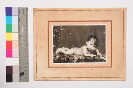 Mildly deteriorated print. Studio solo portrait, full-length shot image of a naked baby wearing only hip chain, anklets, bangles, with a customary symbol on the forehead (potu), lying on a wooden table facing the camera. Vague background.