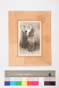 Stained mount. Studio solo portrait, full-length shot image of a old widow, wearing saree, ear ornament called kundalam, sitting on a wooden chair, facing the camera. A side wooden stand with a flower vase on it is kept on the real right side. Plain background, Floor is carpeted. Jaya studio, Kamuthi is printed on the mount.