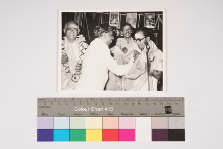 Indoor group portrait, half-length shot image of 4 men. Man standing on the real right corner is with a garland, man next to him is honouring the man on the real left side with a shawl, there is another man standing at the back. Framed images are seen at the back.