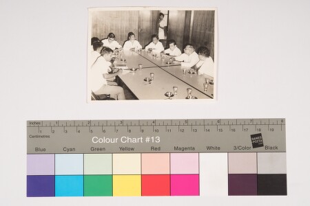 Indoor group portrait, full-length shot image of 9 men, most of them wearing shirt and pants, sitting around a table. Cups and tumblers are placed in front of them. A man is standing at the back, behind the door.