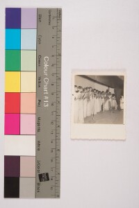 Indoor group portrait, full length shot image of more than 10 women wearing saree, standing beside each other, with hands in praying posture, performing in a mike, on a stage.