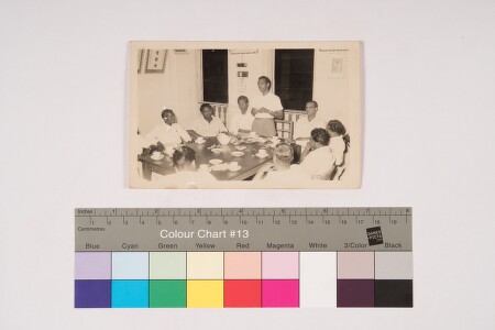 Indoor group portrait, half-length shot image of more than 5 men sitting and standing around a table, discussing with each other, cups are placed on the table. Framed photo is hung on the wall.