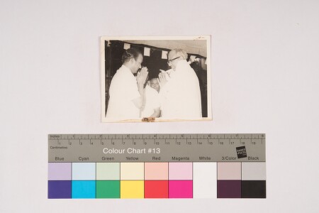 Indoor group portrait, half length shot image of 2 men welcoming each other, man on the real left is wearing spectacles, there is another man standing at the back.