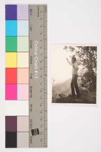 Outdoor solo protrait, full-length shot image of a man wearing shirt and pants, standing on a hill top with hands lifted and facing the side.