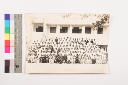 Outdoor group portrait, full-length shot image of more than 60 men, most of them in shirt and pants and more than 20 women in saree, sitting and standing in 7 rows, outside a building, facing the camera.